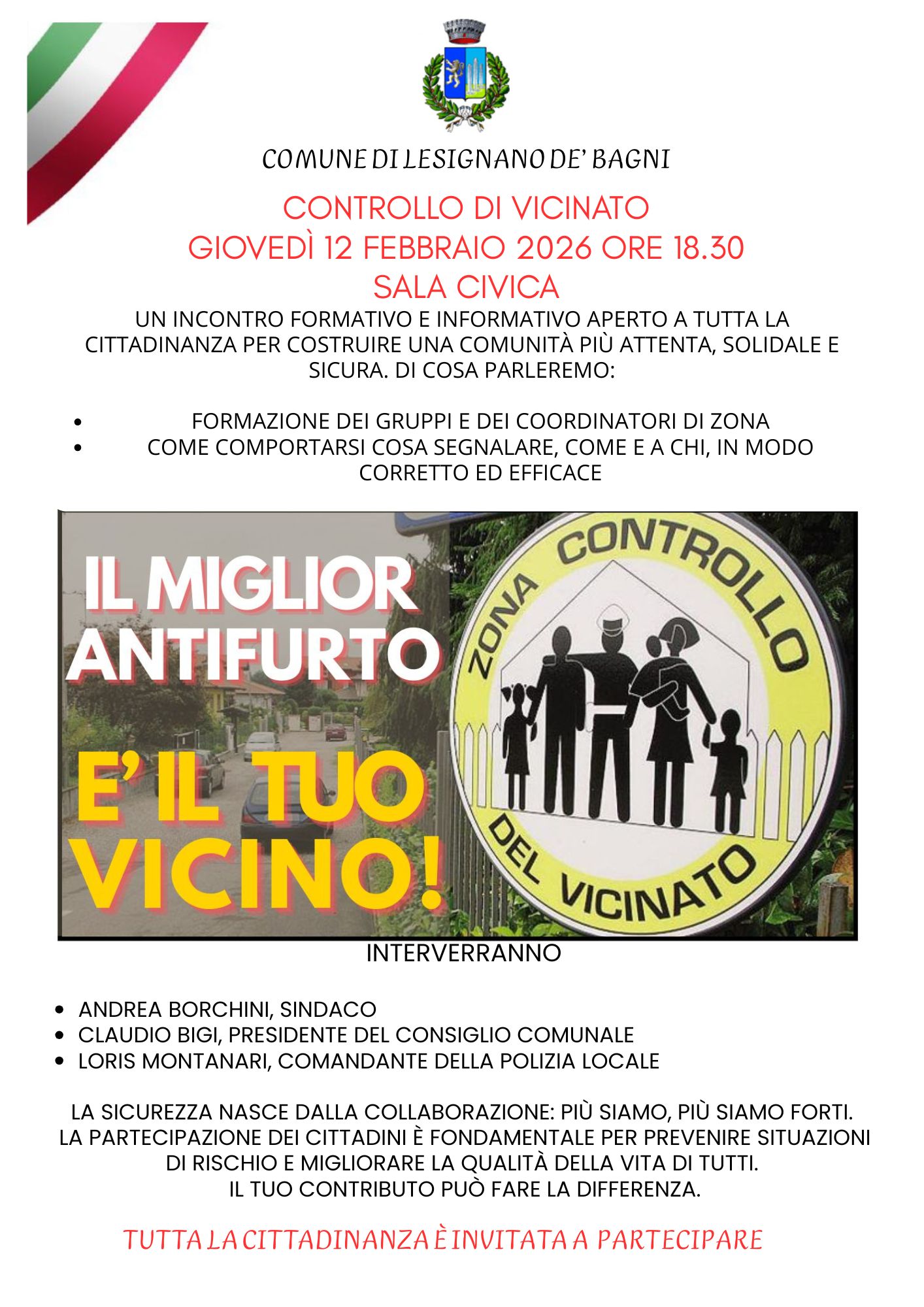 Il Comune di Lesignano de’ Bagni invita tutta la cittadinanza a partecipare all’incontro sul Controllo di Vicinato: