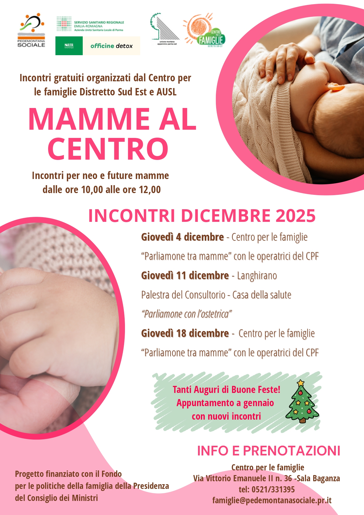 in allegato il volantino con gli appuntamenti di Mamme al Centro del mese di dicembre, gli incontri sono gratuiti e sono organizzati dal Centro per le Famiglie Distretto Sud Est e Ausl